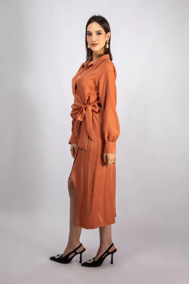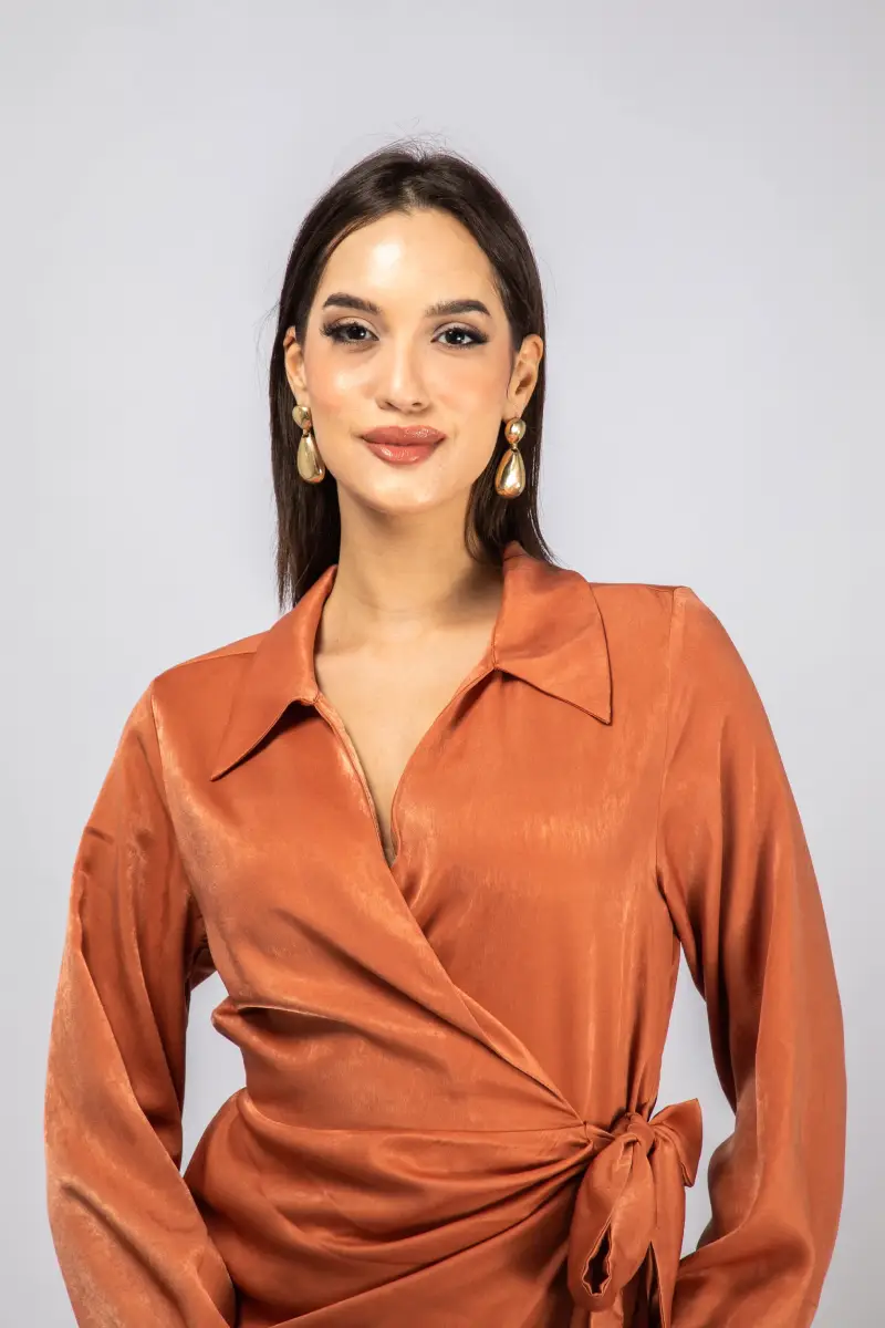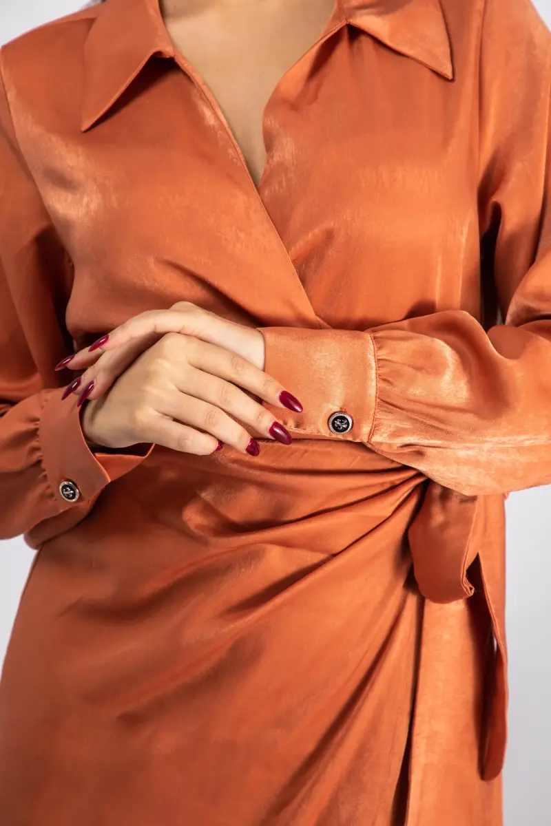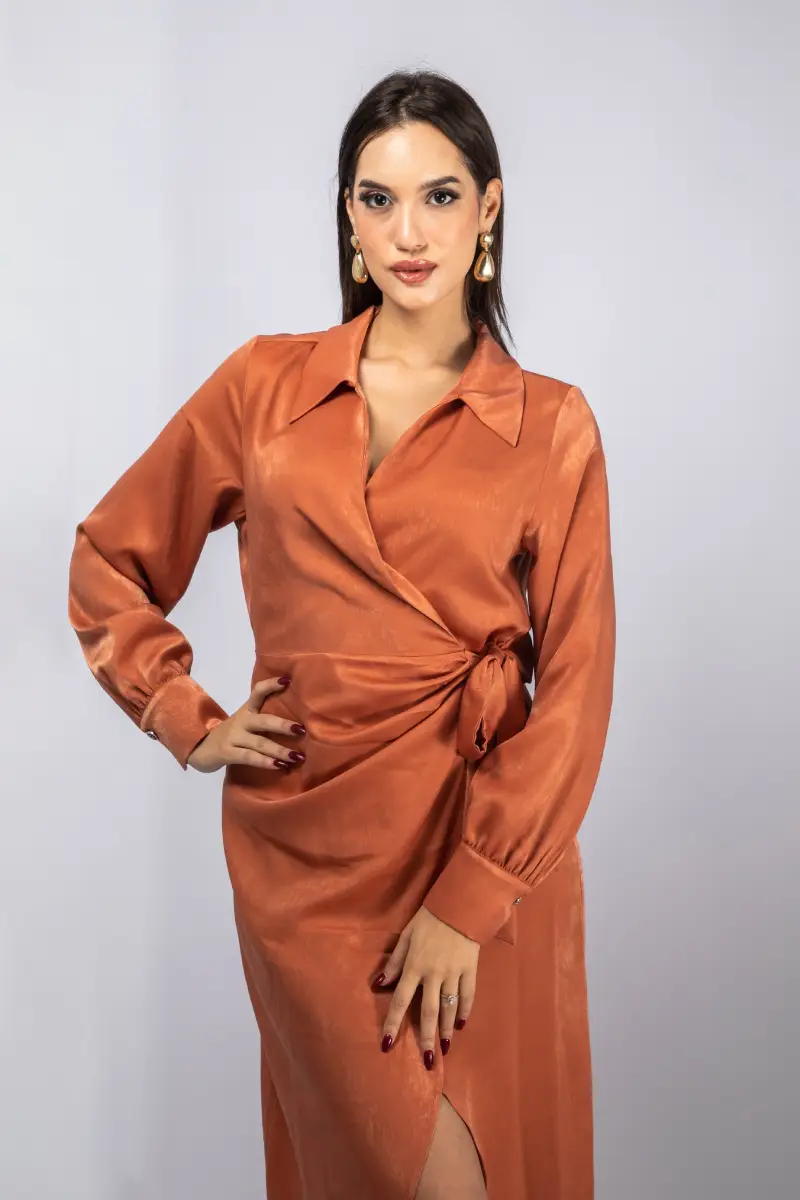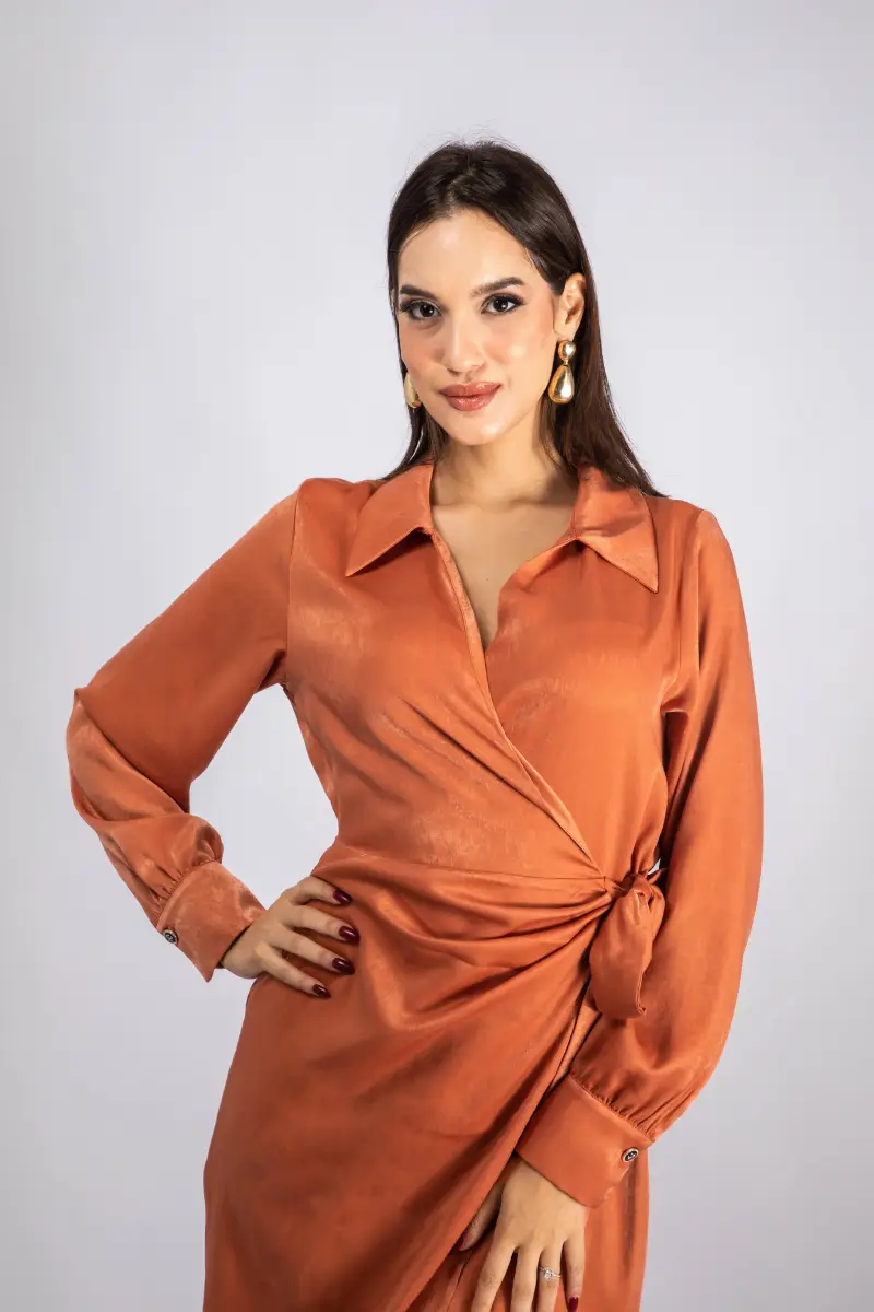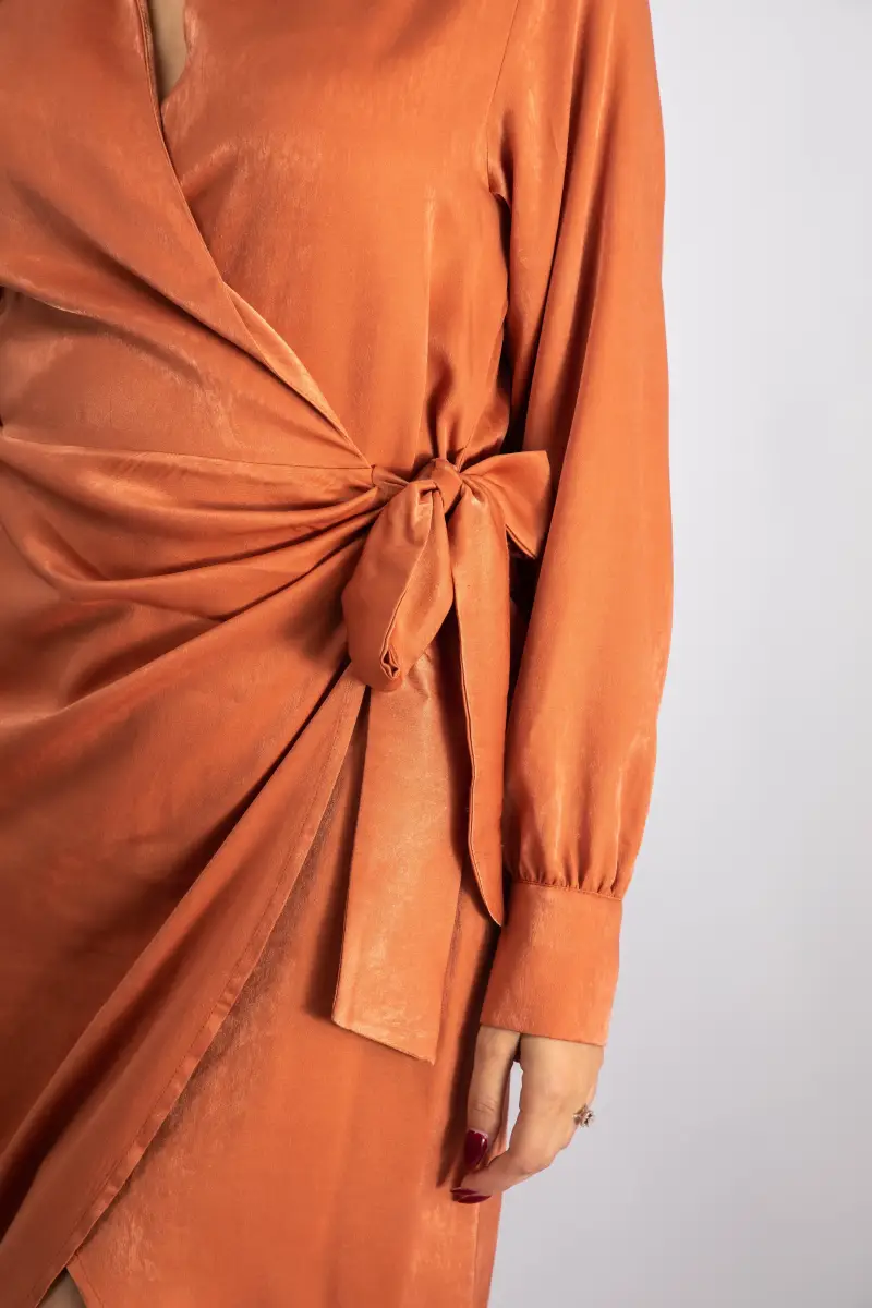 – Robe portefeuille en satin avec un effet drapé sur le devant